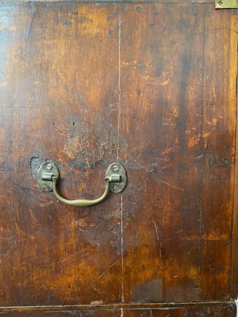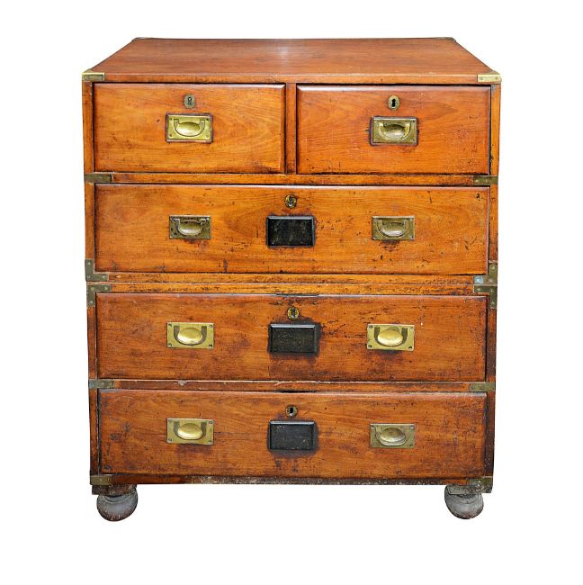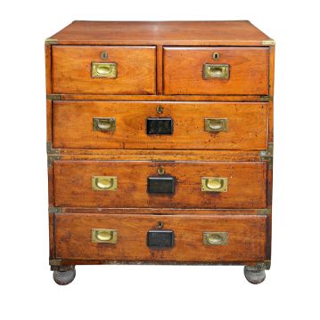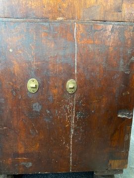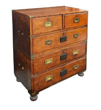 A Victorian mahogany military chest in two parts, with brass corner mounts and later countersunk handles, the two short drawers above three long drawers, on bun feet, sides with brass handlesDue to the size of this item, please note that it MUST be collected from our auction venue at Farleigh Golf Course by 3pm on Friday 17th November. For further information please contact our office on 020 8468 1010height 105cm, width 88cm, depth 50cmCondition: Two side handles lacking, one brass handle present but not original. The lower drawer is lacking its lock. The right side with replaced sections to its rear edge and the lower area. The top has a let in section of timber. The right upper drawer escutcheon is lacking its swing handle. Some brass corner mounts probably later.