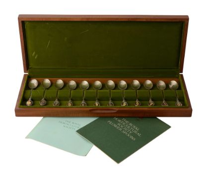 An Elizabeth II cased set of twelve silver RHS Flower spoons