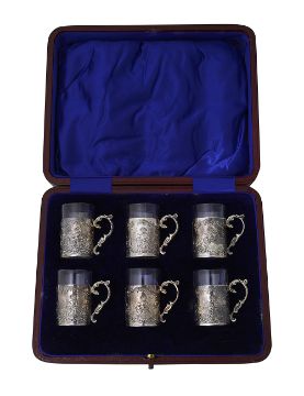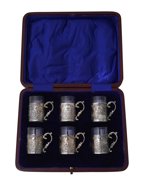 embossed with figures and C-scrolls with fitted with clear glass liners, in a fitted case