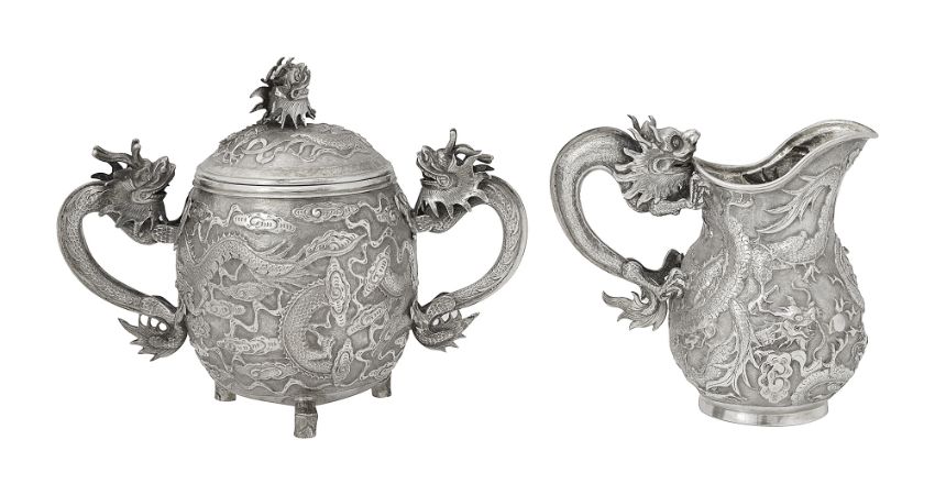 finely embossed with scrolling dragons chasing the flaming pearl on a finely stippled ground with dragon handles, the sugar was with cover and dragon finial on simulated bamboo feet, interiors gilt (2)