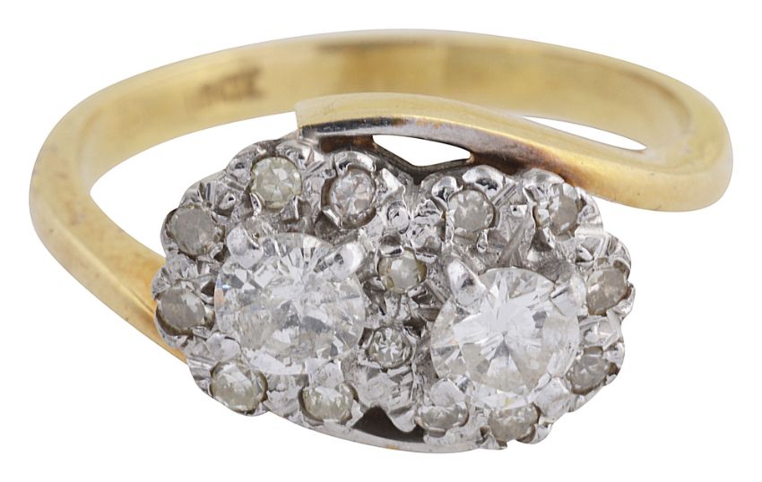 the two diagonal flowerhead clusters each set with a single brilliant-cut diamond within a surround of single-cut diamonds, the shank stamped '18CT'