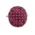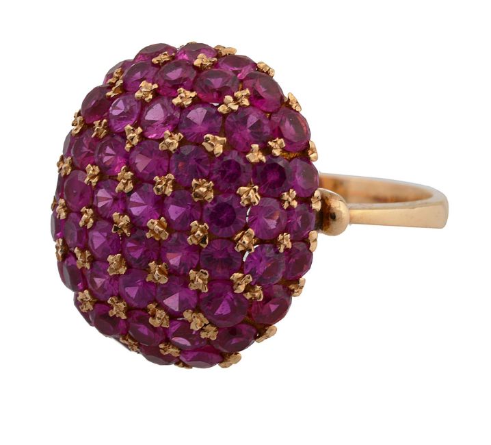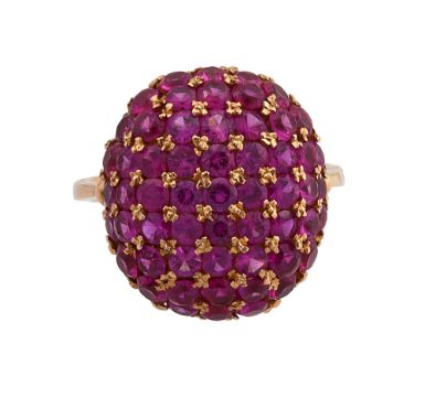 of oval bombé design, and pavé-set with circular synthetic rubies separated by floral motifs, the plain tapering shank partially stamped '750'