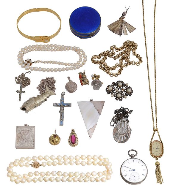 a silver and blue enamel pill box, London hallmarks; two cultured pearl necklaces, both with a 9ct gold clasps, stamped '375' and hallmarked; a silver Celtic pendant, hallmarked; an articulated fish pendant; a fan pendant; a lady's pocket watch, white enamel dial with black Roman numerals, minute markers, subsidiary seconds dial and blued steel hands and other items (qty)