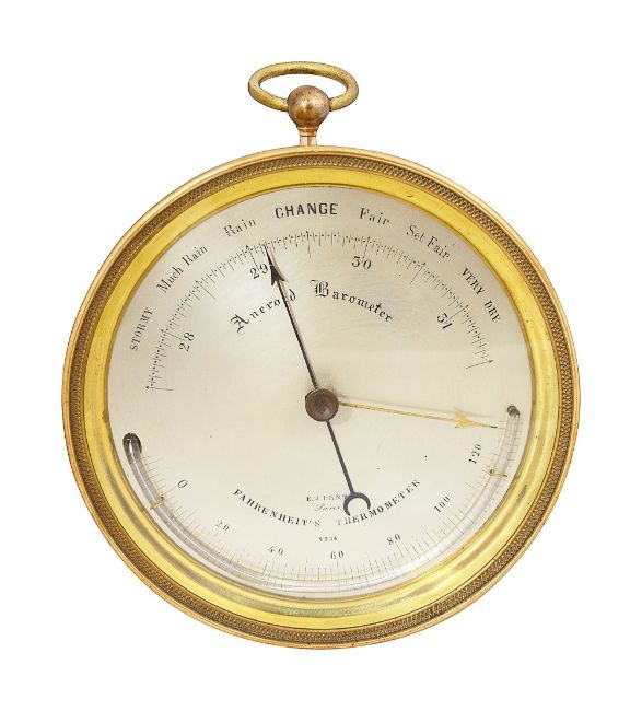 A mid 19th century French brass cased aneroid barometer by E.J. Dentthe 4" circular silvered dial climate indicators and register in inches, over a curved mercury tube Fahrenheit's Thermometer and blued steel indicator, signed E.J. Dent Paris, 1584, lacquered brass drum case with moulded surround and suspension ring case diameter 12.1cmCondition: Good condition. Good condition. When put in a plastic bag inflated with air the needle moves when the bag is squeezed