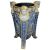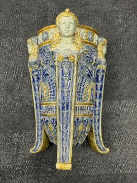 the tapering body decorated in relief with Egyptian inspired motifs of crossed lotus blooms, feathers and palm leaves, supported by three caryatid supports wearing vulture crowns, in tones of blue and brown, unmarked