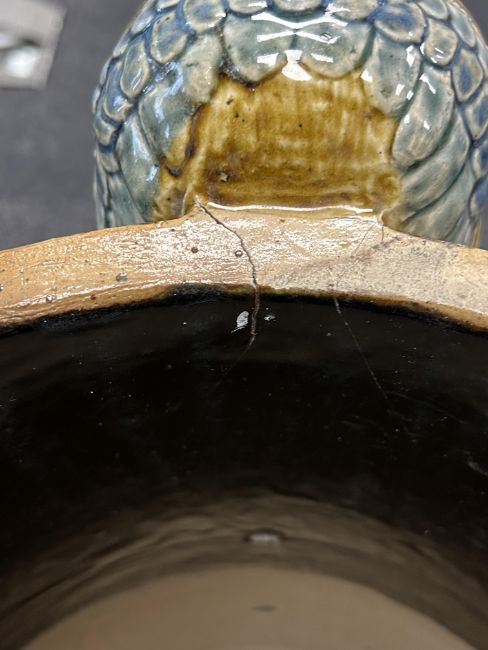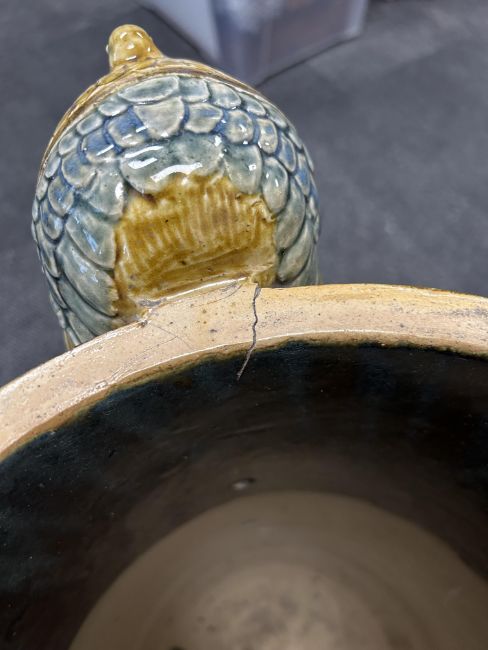 Condition: firing cracks, hairlines and faults where caryatids join body at rim. Small repair to beak of one vulture crown on one caryatid. Otherwise in good condition