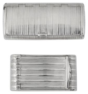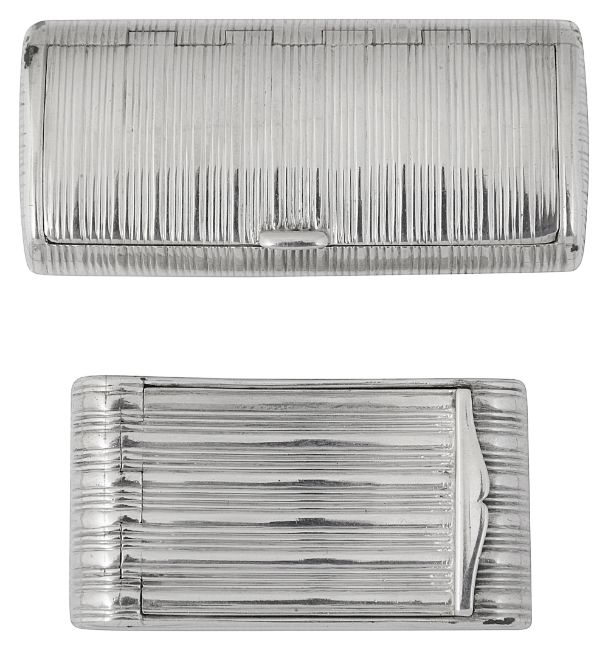 first of rounded rectangular form second of curved rectangular form, both with reeded decoration, the lids with flush hinges and plain thumbpieces, and gilt interiors, (2)
