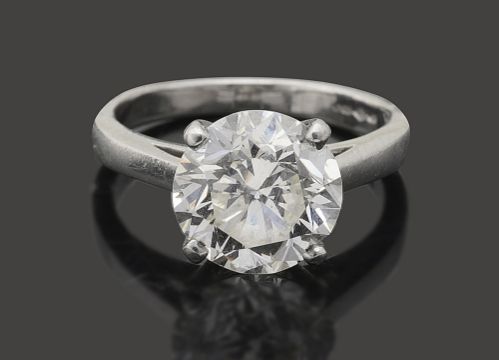 A diamond single stonethe modified brilliant-cut diamond measuring 9.0mm x 9.2mm x 5.8mm, claw-set above the plain tapering shank, platinum hallmarkring size J1/2, 5.4gCondition: Overall condition good/very goodEstimated weight of diamond 3.00 cts, K/L colour, VVS2/VS1 clarity, fluorescence