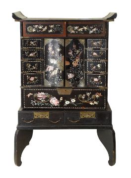 A Japanese Meiji Period black lacquer cabinet on standlate 19th centurywith chased metal mounts and handles, mother of pearl inlaid with birds on flowering prunus and flowerheads, the top with a rear gallery above two sliding doors, a pair of central bowed doors enclosed by eight canted small drawers and a lower drawer, with side handles, the stand with two drawers and shaped feet height 84cm, width at top 52cm, depth 31cm at baseCondition: In tired houseworn condition. The rear gallery is present but in three sections and needs to be put back together. The escutcheon to a central door is present, though detached, there is a key but it does not work.A drawer to the stand is lacking a handle.