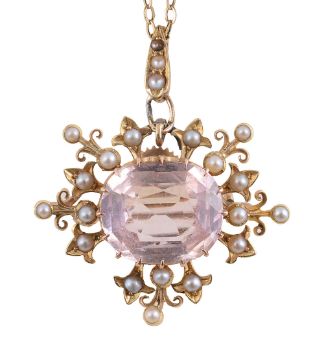 An Edwardian pink topaz and seed pearl brooch/pendantthe central pink topaz claw-set above the openwork scrolling and fleur de lys seed pearl-set surround, partly closed back yellow gold setting, detachable brooch fitting; together with a later fine oval trace link chainwidth 3.1cm, 9.1g; chain 1.4gCondition: Overall condition fair/good. An attractive piece.Two fleur de lys missinglater jump ring to the suspensory loop