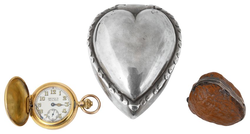 A late Victorian silver heart trinket box, a gold plated full hunter fob watch and a silver mounted walnut pillbox