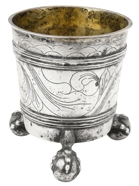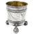of bucket form with twin moulded girdles and scrolling foliate engraved decoration, on three ball and claw feet, interior gilt and rim