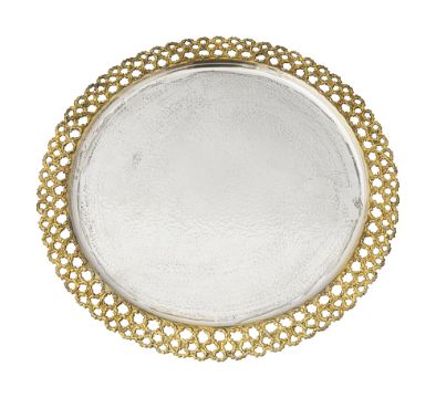of circular form with planished decoration, gilt pierced and textured border, numbered 36 and crested to underside for Allied Dunbar, n a fitted case stamped in gilt President Falcon Award 1979,