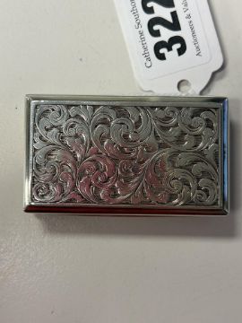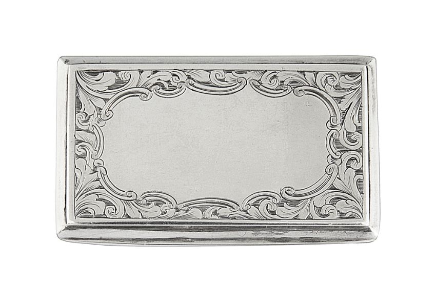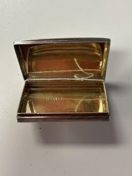 rectangular with concave reeded sides, the hinged lid with raised thumbpiece engraved with a foliate scroll border, the base with conforming decoration, interior gilt