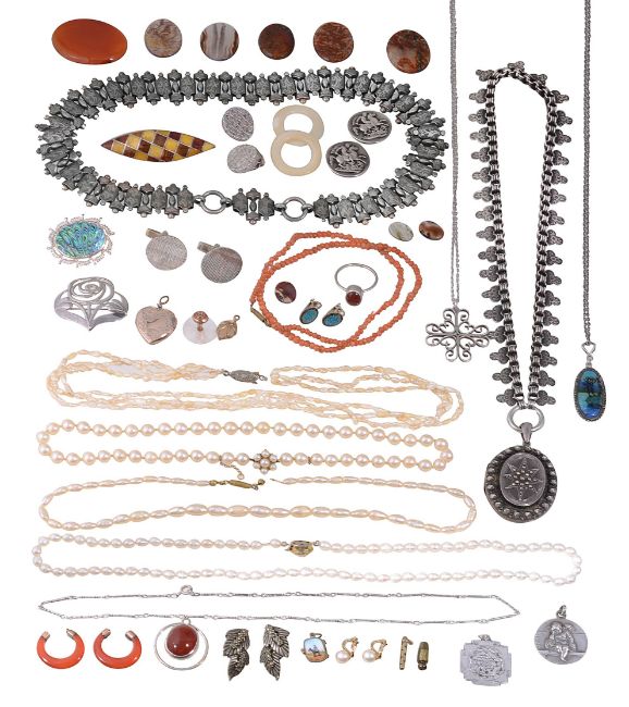 A collection of costume jewellery a Victorian silver locket suspended on a thick fancy-link chain, a selection of hard stone discs; a pair of oval cufflinks stamped “12ct”; a string of cultured pearls, clasp stamped “9ct”; a pair of silver circular dress buttons depicting George slaying the dragon, stamped with hallmarks; a silver two tone amber brooch, stamped ‘925’ with Polish marks; a coral beaded necklace; a rose brooch designed by Rennie Mackintoch for National Trust, stamped “925”; and other items (qty)total approx. weight of marked silver 0.72ozt, total approx. weight of Victorian locket 0.43oztCondition: