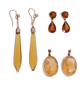 trefoil bar brooch, comprising of three mixed cut citrines; a pair of synthetic oval citrine ear-pendants, set within 9ct gold mounts, stamped with Birmingham hallmarks; a pair of citrine drop ear-pendants, stamped "9K" and a pair of briolette citrine drop ear-pendants (4)