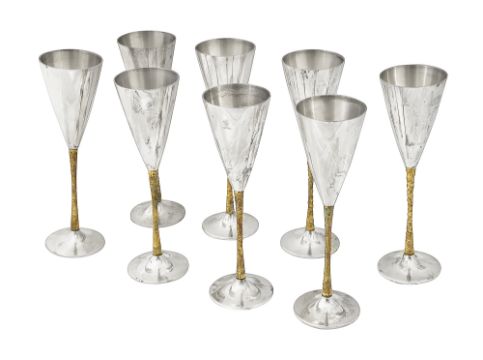 Stuart Devlin. (1931-2018) A set of eight Elizabeth II Modernist silver and parcel-gilt champagne flutes