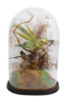 perched on a branch in a naturalistic setting with grasses and another bird, under dome on an ebonised base, raised on compressed bun feet,
