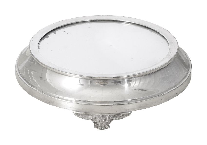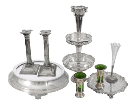 to include a Wedding cake stand by Walker & Hall, circular with mirror plateau, on paw feet, a two tier centrepiece with central trumpet vase, a pair of Corinthian stop fluted column candlesticks, a pair of small Art Nouveau pierced vase with green glass liners, a George III old Sheffield plate salver, a cut glass spill vase on domed lobed base, (6)