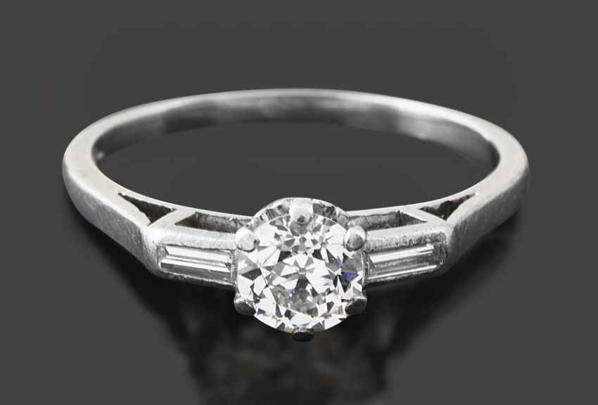 the old brilliant-cut diamond estimated to spread 0.50-0.60cts, set to either side with a baguette-cut diamond, the plain shank stamped 'PLAT'