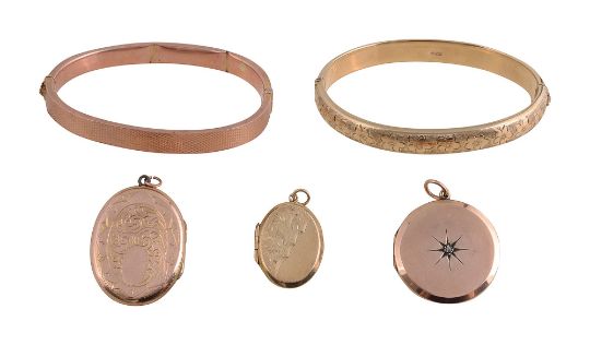 9ct gold hinged bangle, stamped with hallmarks, chased to one half with floral design; 9ct rose gold hinged bangle, stamped with hallmarks, chased to one half with geometric design together with an oval locket, chased to one half with a scrolling design, stamped to reverse "9ct Bk-Ft" and two lockets, stamped to back "9ct back and front " (5)