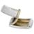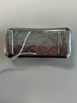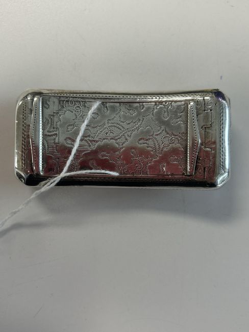of curved rectangular form, the lid with flush hinge and secondary hinged compartment and the base prick dot engraved with trailing vine leaves, the sides with a waved border, interior gilt
