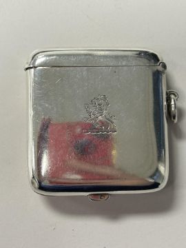 of plain rectangular form, with hinged covers, one enclosing two sprung coin holders for full and half sovereigns, suspension ring to side, crested
