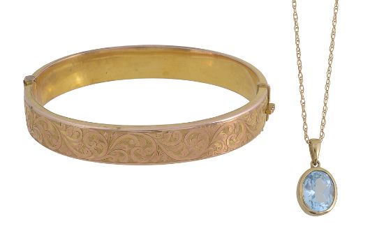bezel set oval mix-cut blue topaz suspended on a fine fancy-link chain, stamped to suspension loop '375" together with 9ct gold hinge bangle, chased to one half with scrolling foliate design, stamped with Birmingham hallmarks, with safety chain (2)