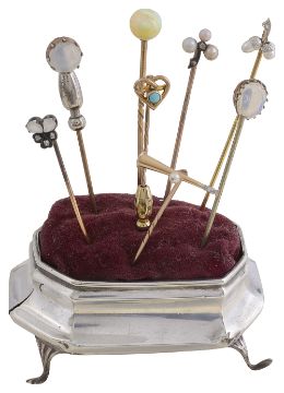 a circular opal bead with good play of colour; a seed pearl and diamond-set trefoil mounted in silver; a seed pearl and diamond twin acorn; a yellow gold openwork heart with a cabochon turquoise collet to the centre; a yellow gold and seed pearl hunting horn; a moonstone and rose-cut diamond pansy; a circular collet with pale blue hard stone; and an oval water opal cabochon (a/f); four with keepers, and displayed in a rectangular silver salt cellar pin cushion (a/f)