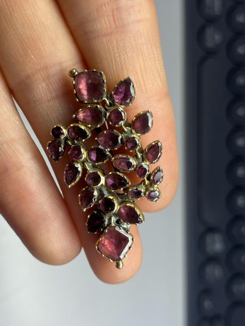 a graduated garnet 'S' scroll and bud hair ornament with a central flowerhead surmount, closed back setting with a loop at each end; a closed back floral and foliate spray colourless paste brooch (repaired); a closed back garnet-set brooch (repaired); and a four stone foiled (a/f) pink paste brooch, closed back setting (4)