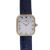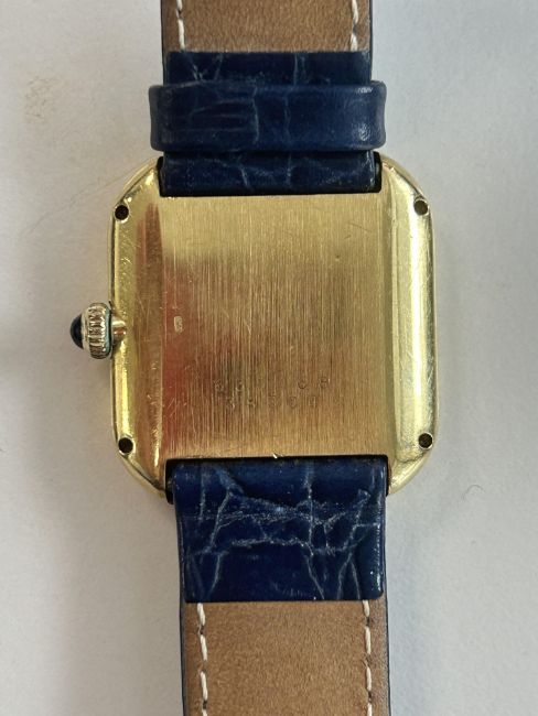 white rectangular dial with rounded corners, black Roman numerals, minute track and blued steel hands, blue cabochon sapphire set winding crown, screw caseback with Swiss control marks verso and numbered 635168 38304, with blue leather strap bracelet