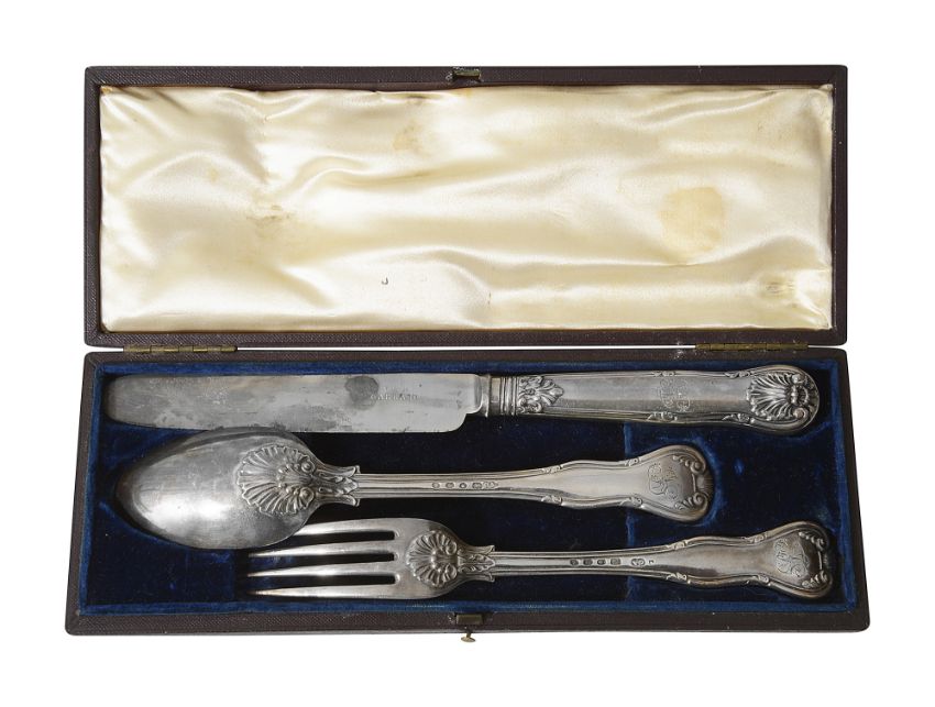 An early Victorian cased silver three piece Kings husk pattern christening set