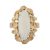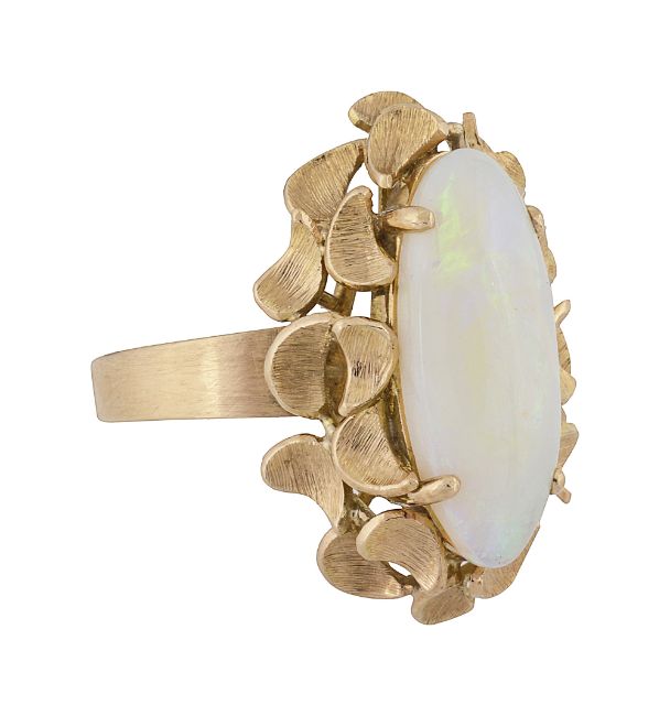 oval cabochon opal, claw-set raised above an open-work chased foliate border, the basket-setting set to a plain shank, stamped "14k"