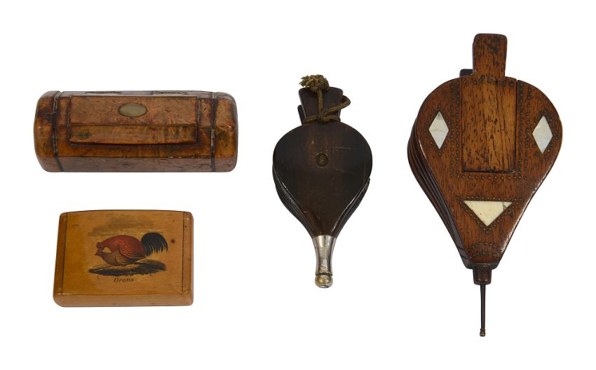 A 19th century treen snuff box in the from of a pair of bellows and three other boxesfirst fruitwood inlaid with mother of pearl, bone and brass pique work with sliding cover, a pair of miniature horn bellows, a burr wood snuff box of octagonal cylinder form, horn lined and a Scottish Mauchlineware sycamore snuff box, the hinged lid with painted transfer of a mating cockerel and hen entitled 'Gratis', (4)first length 11cm.Condition: All items have general wear and tear commensurate with age. Sliding cover handle on large treen bellows has been repaired and has general wear and tear but otherwise no major damage. Miniature horn bellow have a plug to side which cannot be removed and therefore this does not open and few minor chips. The Mauchlineware box in very good overall condition. The cylindrical box in good condition just general wear and a few knocks.