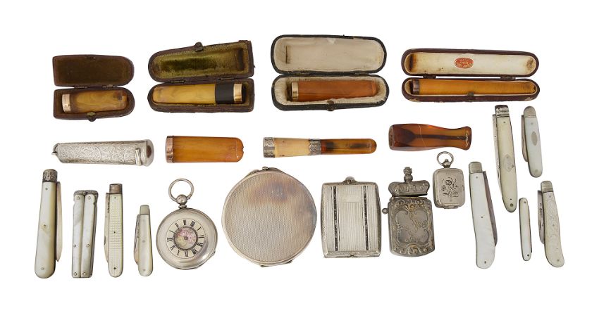 comprising assorted amber cheroot holders on with 15ct gold rim the others mostly with 9ct gold rims and cased, a silver cheroot holder case with foliate engraving, Birmingham, 1907, Joseph Gloster Ltd., assorted silver folding fruit knives with mother of pearl grips, a folding pair of steel scissors with mother of pearl grips, a nickel crown top vesta case, A Chinese carnelian snuff bottle, an alpaca powder compact, (qty)