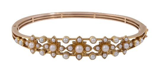 an open-work central panel of pearls, set in a slightly graduating linear form of floral mounts, to a trifurcated hinged section bangle with safety chain