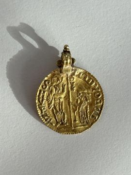 of Etruscan Revival articulated pendeloque design with applied wirework decoration and tassel fringe, later hook fitting; together with a Venetian 'Zucchino' Ducat probably 15th century, converted into a pendant,