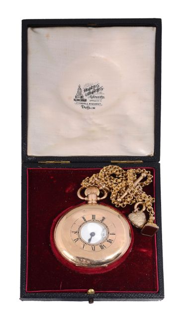 A late Victorian fancy belcher link watch chain and a Waltham gold plated half hunter keyless pocket watch