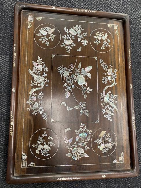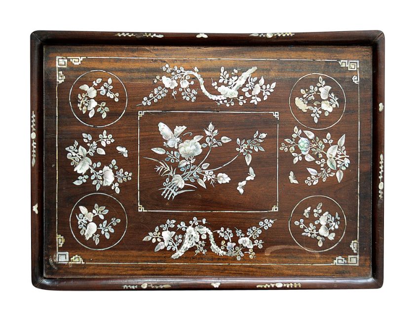A Chinese huang huali and mother of pearl inlaid traylate 19th centurythe panel with a central flowering bough with a butterfly and enclosed by floral corner roundels and further flowering boughs, within a rounded edgelength 54cm, wide 38.5cmCondition: One roundel with a replaced silver metal inset. One mother of pearl oval lacking to the tray's edge. There are marks to the surface from use. The panel has shrunk a little and there are narrow gaps to the corners.