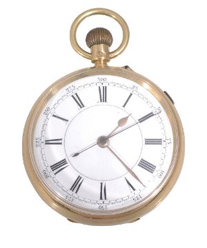 the enamel dial with raised chapter ring, Roman numeral and stop watch feature, with engraved initials to reverse of case, the inside of the case and dust cover both hallmarked