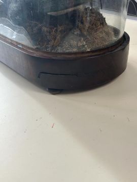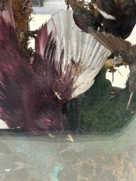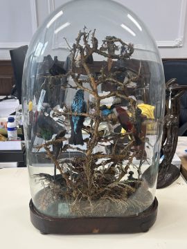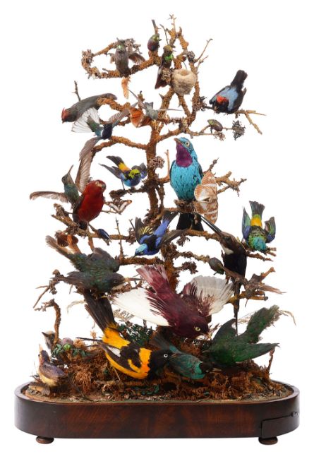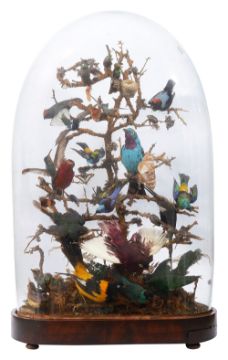 Taxidermy. A Victorian display of South American birds, beetles and butterflies by James Gardner the twenty one birds to include Pampadour Cotinga, Red Legged Honey Creeper, Spangled Cotinga, Green-headed Tanager, Paradise Tanager, Campo Troupial, humming birds, etc, mounted naturalisticly on a central branch, under dome on mahogany base raised on compressed bun feet, bears paper trade label for 'J. Gardner Bird Preserver to the Queen ... 420 Oxford Street'height 76cm.Condition: Quite bright and unfaded. some damage to tail of one humming bird. Some feathers have been shed and are present on base. Short scratch to glass on dome. Some losses to veneer on base, crack to base