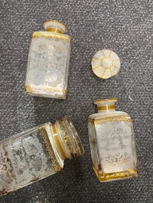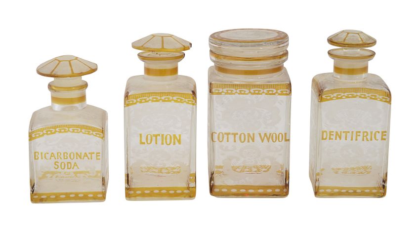 square, etched decorated with rocaille and buildings to one side and stags to the other, lettered Cotton Wool, Lotion, Bicarbonate Soda and Dentifrice, (4)