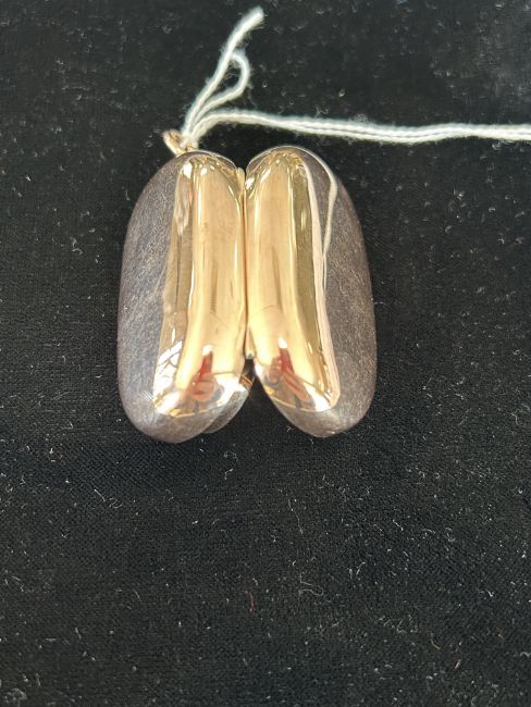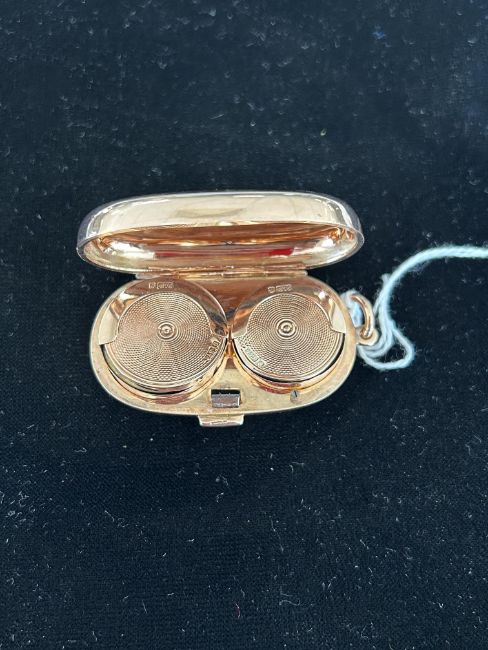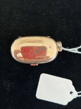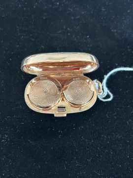 of plain rounded rectangular from, the hinged cover enclosing two sprung coin holders, suspension ring to one end