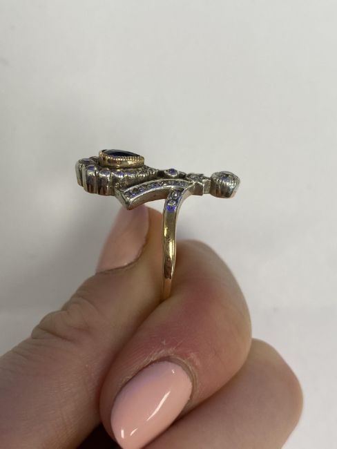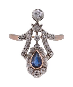 the pear-shaped sapphire collet and old-cut diamond cluster to the old brilliant-cut diamond collet terminal, plain tapering shank