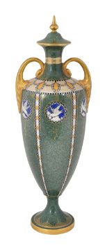 lidded and of urn shaped form, with twin gilt scroll handles and decorated on a powder green ground with swagged ovals, chequer bands and medallions with doves, on a spreading foot, underside with printed Royal Worcester England date mark for 1920, shape number 2710, and two registration numbers