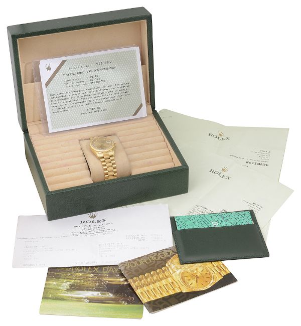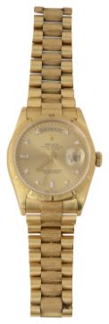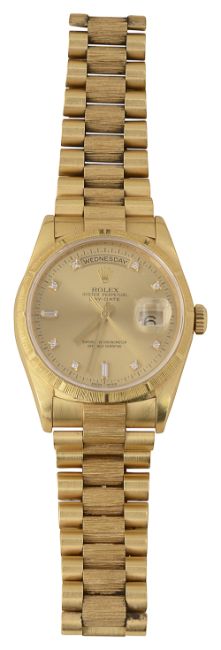 circular sunburst champagne dial set with single diamond and baguette cut diamond markers, black outer minute track, batons hands and centre seconds, magnified date aperture at 3 o'clock and day aperture at 12 o'clock, sapphire crystal, selfwinding automatic movement, the case with bark finished bezel with polished hour markers, screw down oyster back and crown, serial number T623*** 18ct yellow gold polished, brushed and bark finished President bracelet with signed foldover clasp, stamped 750 and signed Rolex and numbered 8723, accompanied by original guarantee dated 98 and full service history with International Service Guarantee dated 06, wallet, instruction booklets and calendar card in a fitted green leather case with suede interior