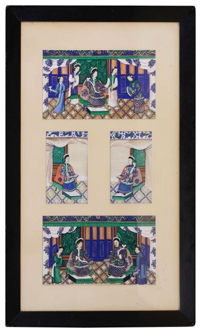depicting Interior scenes with seated official and wife with attendants, mounted, framed