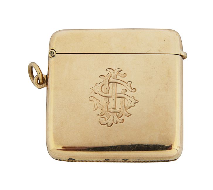 of plain square form with rounded corners, hinged cover and suspension ring, engraved with initials