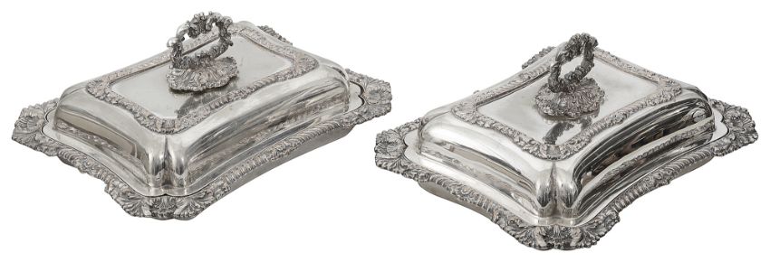 rectangular shaped form with gaddrooned and acanthus leaf borders with detachable handles, stamped Walker & Hall Sheffield Plate Old Style