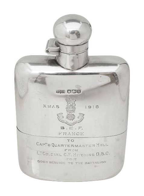 of plain rectangular curved form with bayonet fitting hinged mushroom cap and detachable cup, bears regimental insignia for 2/5th Battalion Loyal North Lancashire `regiment Xmas 1918 B.E.F. France to capt 7 Quartermaster Hill From Lt Colonel C.F. Hitchins D.S.O. for Good Service to the Battalion